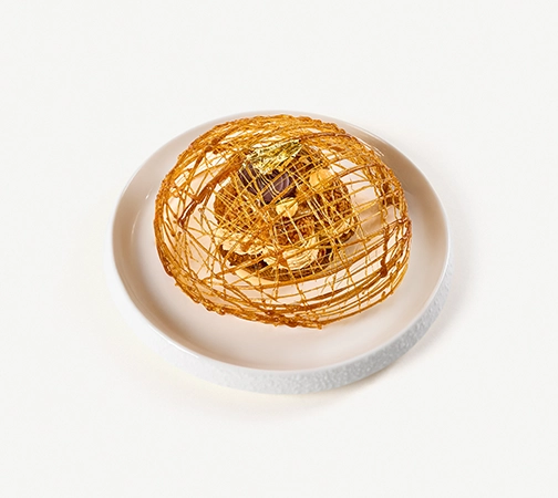Crunchy Hazelnut Topped Craquelin Choux filled with Hazlenut Cream, Praline,Toasted Nuts, topped with Edible..