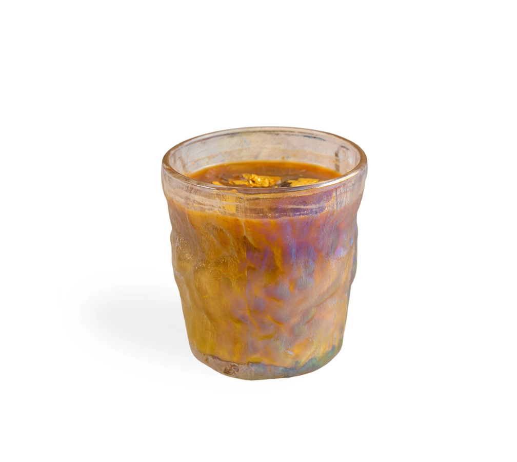 Crunchy Hazelnut Topped Craquelin Choux filled with Hazlenut Cream, Praline,Toasted Nuts, topped with Edible Gold Leaf, Covered with an Golden Sugar Cage on Vanilla Sauce